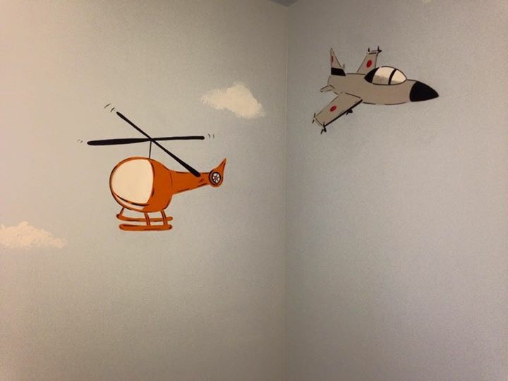 The bright reds and blues used in the different hand painted aeroplane artwork adds a pop of colour across the wall areas without making them too busy.