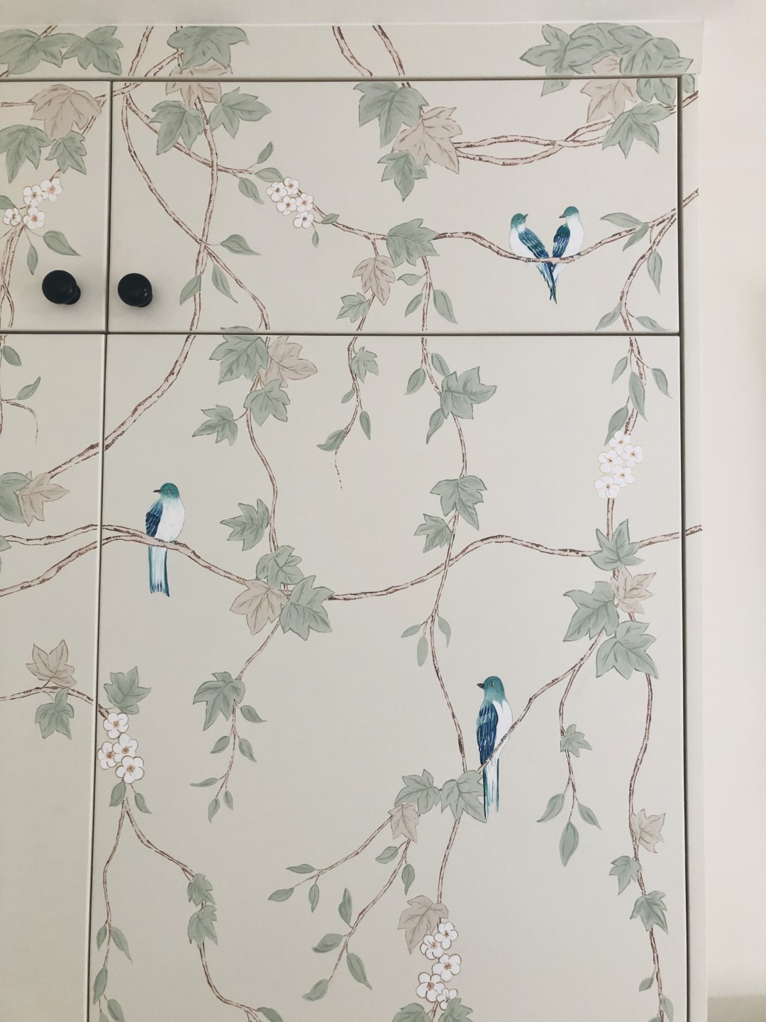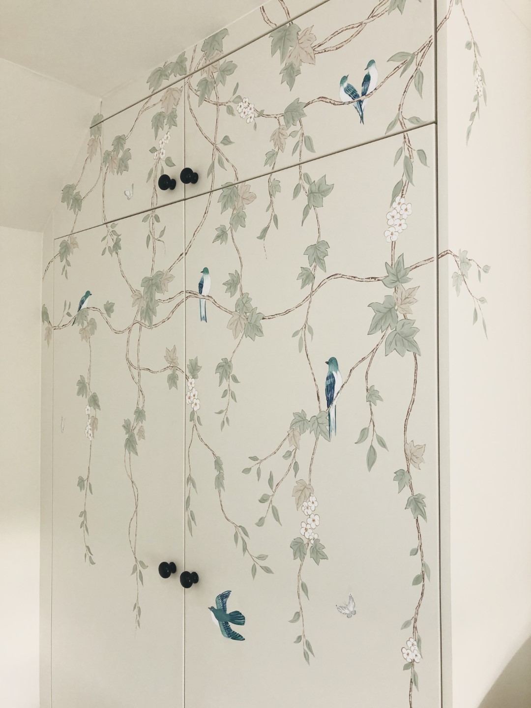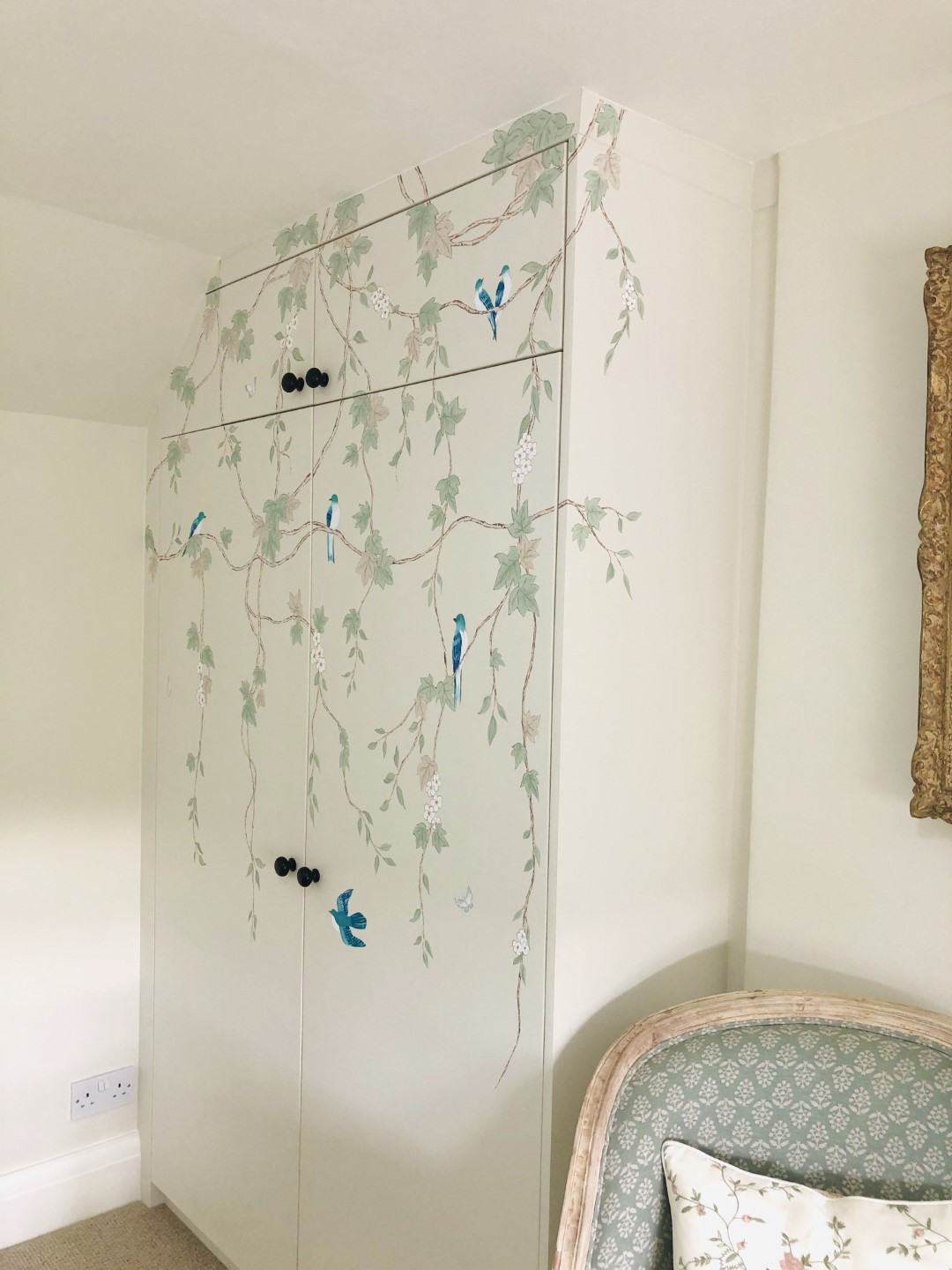 This stylish hand painted chinoiserie wall mural was designed specifically for the fitted wardrobe it was painted onto, and featured decorative hand painted birds and white blossom flowers.