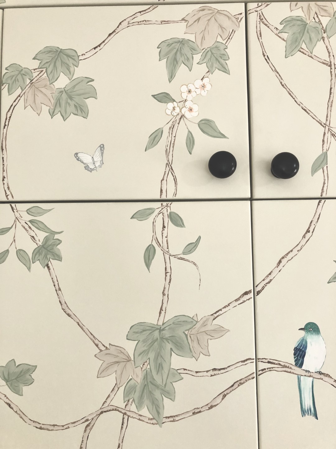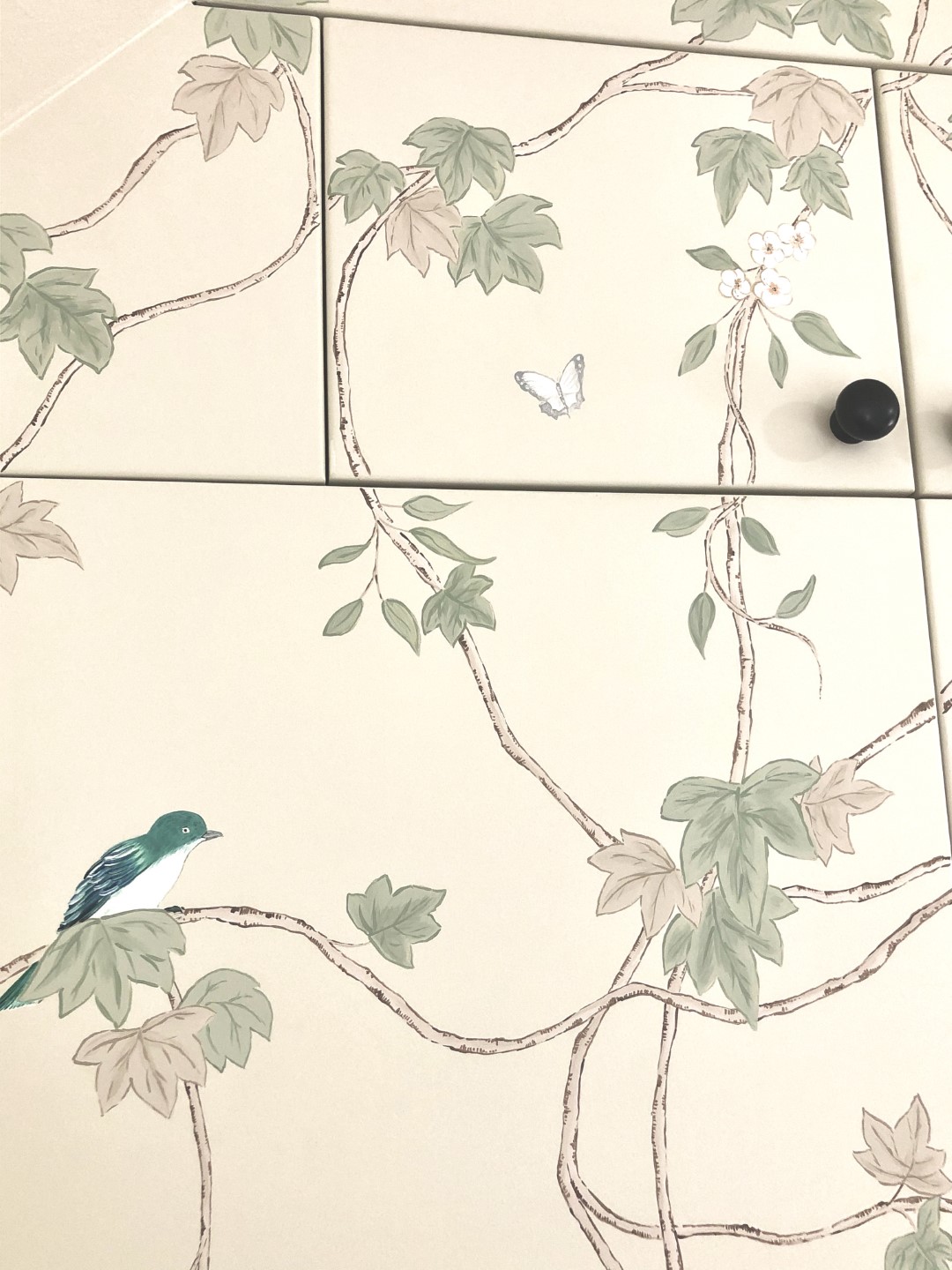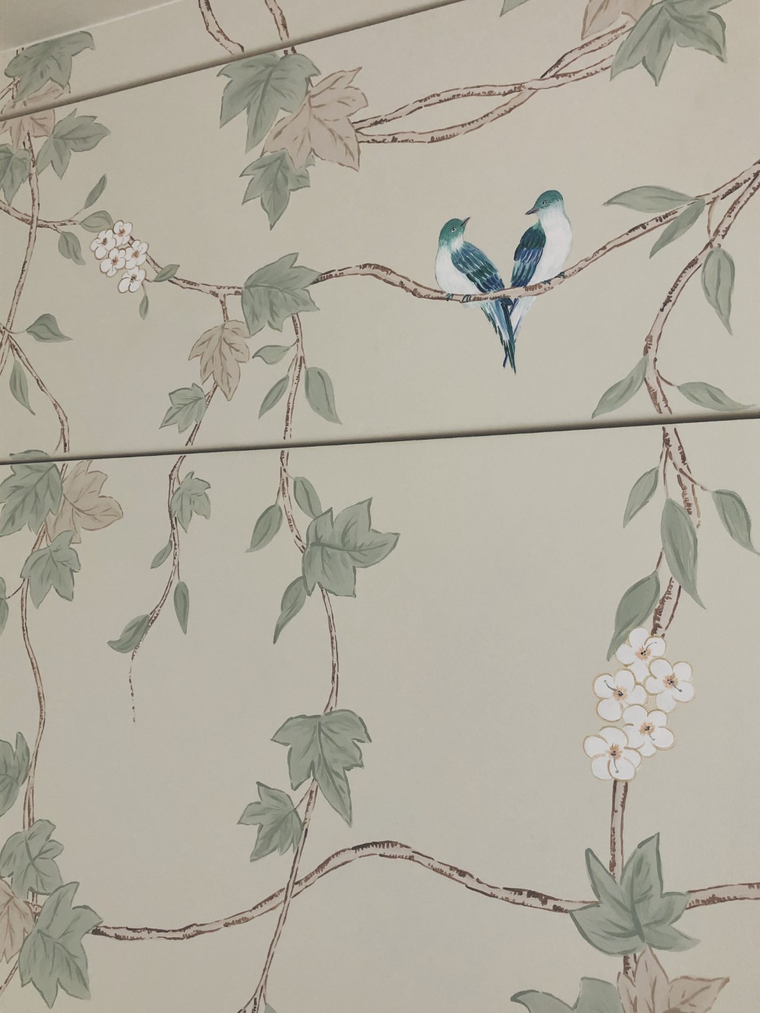 This stylish hand painted chinoiserie wall mural was designed specifically for the fitted wardrobe it was painted onto, and featured decorative hand painted birds and white blossom flowers.